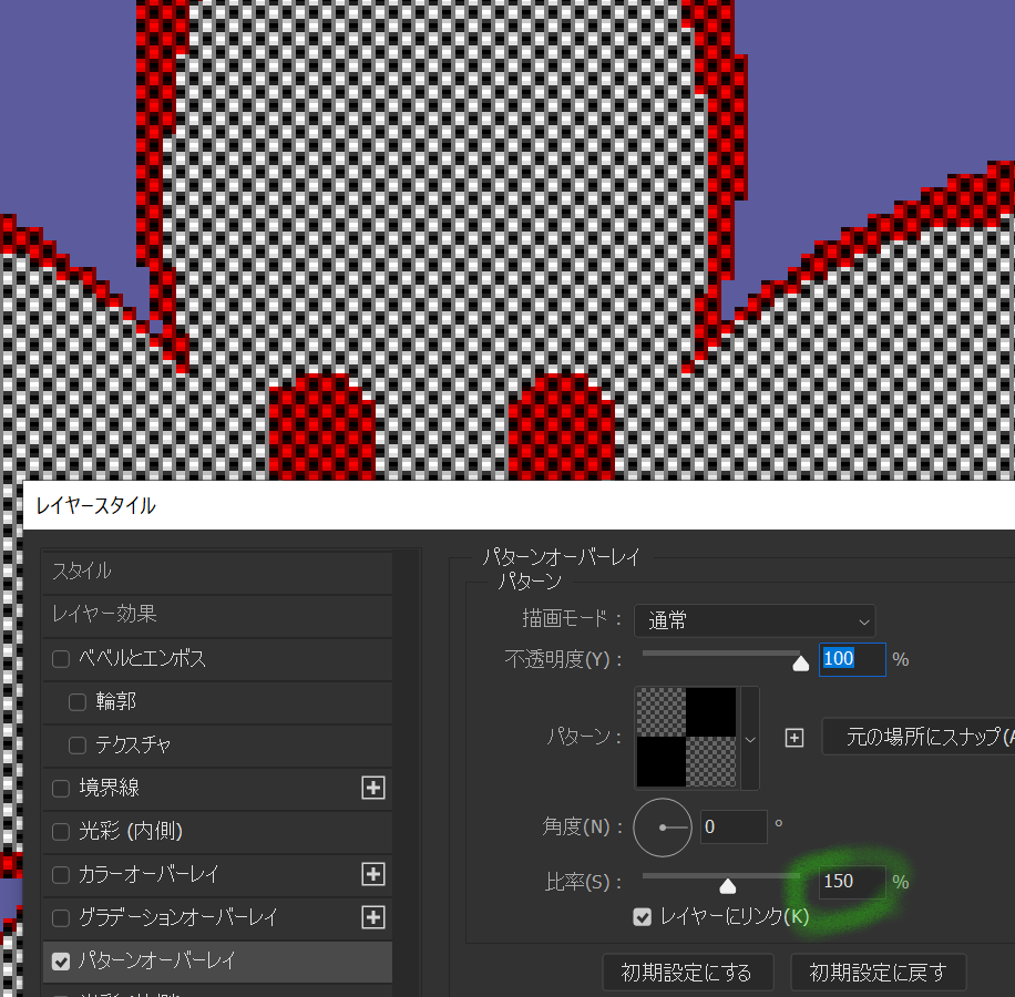 これは合点の挙動だが、パターンは拡大するとぼやけるのである。ニアレスネイバー法だとかディティールを保持だとか拡大縮小のロジックは選べないのである。パターンオーバーレイを使っている場合は注意したい。画像を拡大したい場合では、パターンの倍率を変化させたくない場合は、画像サイズは拡張して、レイヤーすべてを拡大するなどの方法をとると良いかもしれない。