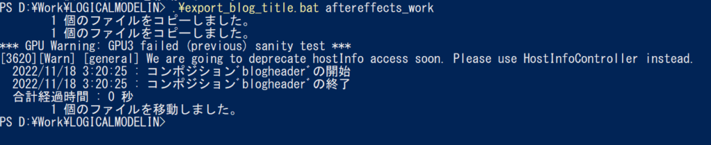 AfterEffectsを立ち上げていない状態で、コマンドプロンプト(ここではpowershell)でバッチコマンドを実行する。引数にはテンプレート素材フォルダ名を与える。
