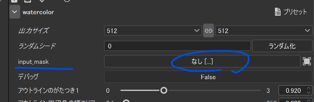 • パラメータがたくさん表示されるので、あらかじめ用意した白黒のマスク画像を input mask の項目のボタンで開く。なお、画像は正方形で2の倍数のドット数であるのが良い。512×512とか。