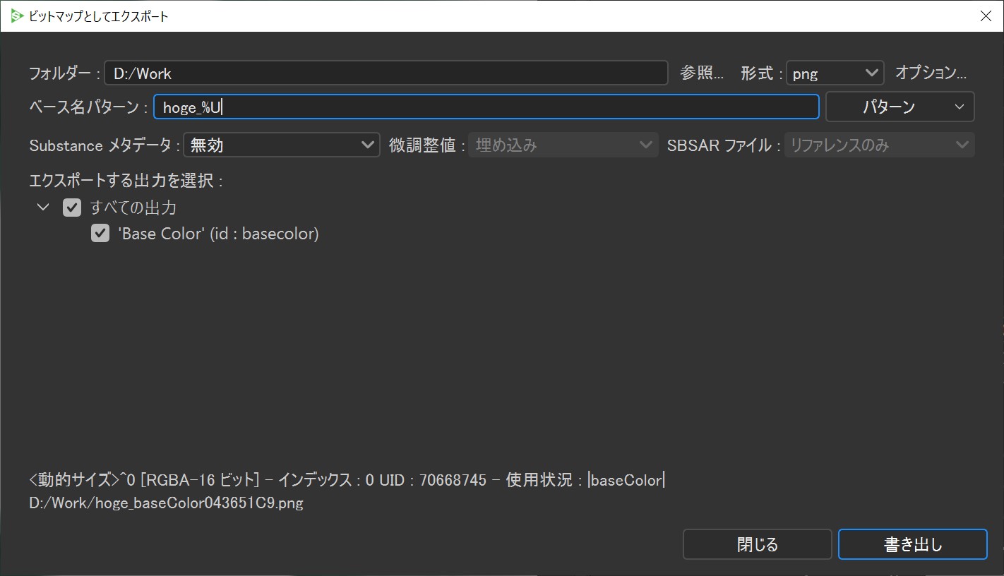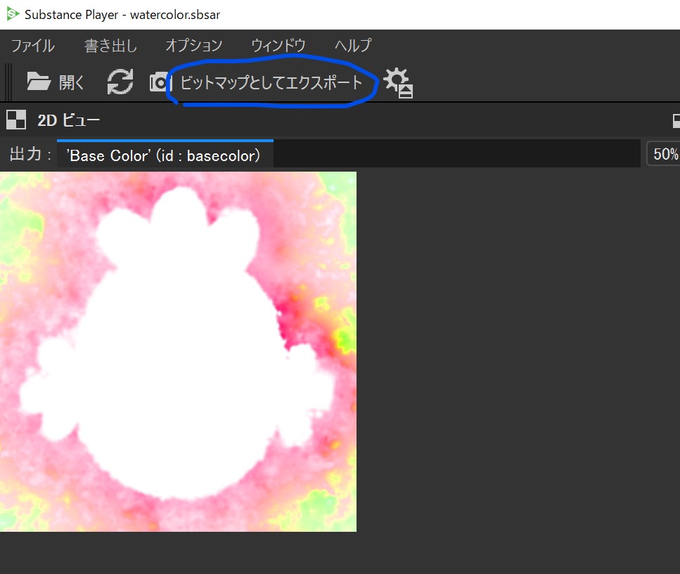 sbsar ファイルで作ったフィルターはSubstance Designer やその他ソフト上動かすことができるが、有料ソフトを持っていないくても、無料配布されている Substance Player でsbsarを動かして処理結果の画像を書き出しする事ができる。