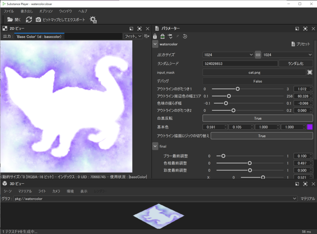 白黒のマスク画像を入力すると水彩画風に変換してくれるフィルターをSubstance Designer で作成した。まだ直したい部分も多いのだが、とりあえず使える状態になったので公開する。ダウンロードは記事の最後あたりに。