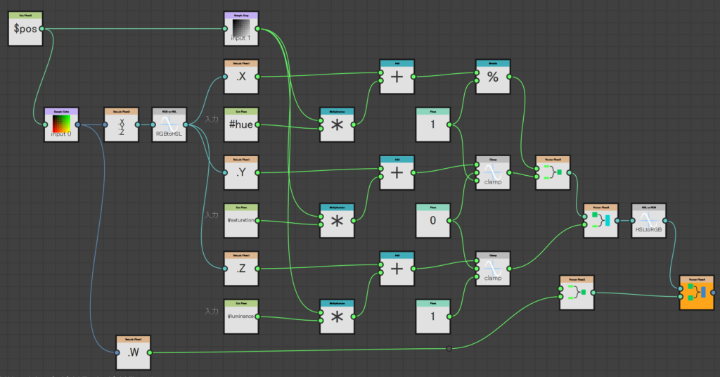 このように、一度HSL空間に変換し(そういうノードがあるので便利)グレースケール画像の値と個別パラメータの重みを乗算したものをそれぞれのチャンネルに足している。色相だけは値を繰り返すのでクリッピングしないで0と1の間を値がリピートするようにしている。最後にRGB色空間に戻す。アルファチャンネルだけは何も変化しないように特別扱いしているのに注意。