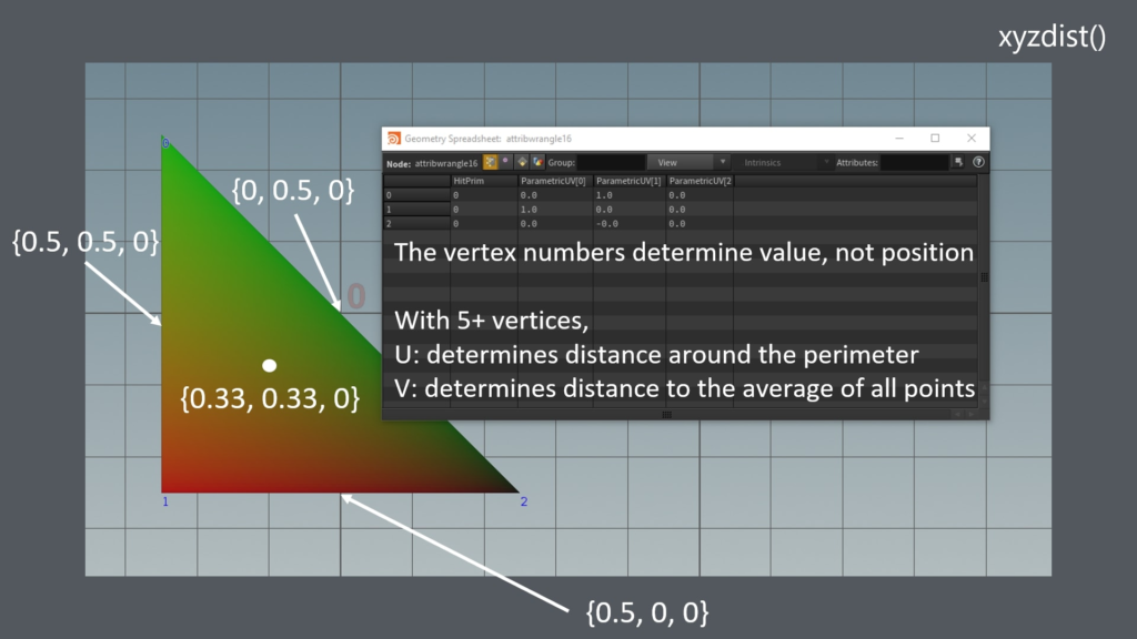 …確かに、頂点5個以上だとU(赤で図示)が外周で、V(緑で図示)が全頂点の平均からの距離、になっている。なぜ想像できなかったんだ。全頂点の平均っていうのはプリムの真ん中ですな。