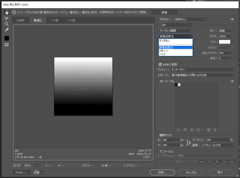 フォトショからの書き出し画面。古いwebようの書き出しにはディザ設定が存在する。