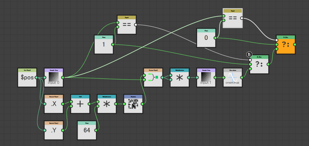 ディザ画像は3種類用意した、今回のノードグラフでは一番右の物を使っているがやり方によっては真ん中とか左でもよさそうである。なお通常の線形グラデーションのモノクロ値を二乗してグレー領域のディザ情報を増やしたつもりだが、ガンマ値の調整と絡んできてなんかややこしい。