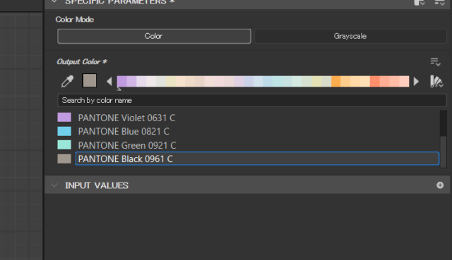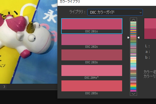 今度は画面上の任意の色から近しい色見本(PANTONE、DIC他)を選択する方法。