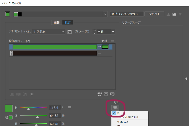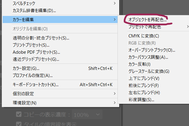 任意の色をしたオブジェクトを選択した状態で、メニューから ”オブジェクトを再配色” を選ぶ。