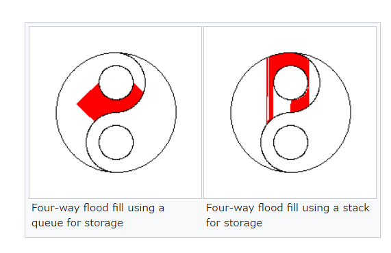 アニメーションは処理に必須ではない。塗りを1フレームで終わらせることもできる。wikipediaの解説例と少し塗る経路や太さが異なるのは、3Dサーフェース上での適用をふまえて、隣接エリア判定が単純に上下左右にあるものを採用していないから。しかし、QueueとStackどちらを処理のタスク管理に使うかで結果が変わるのは同じだ。
