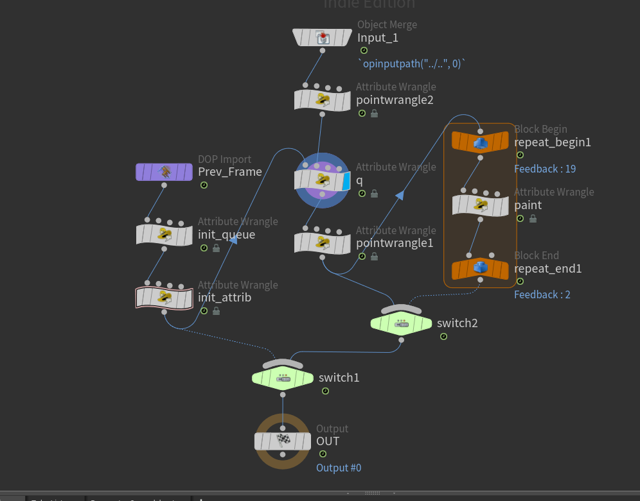 }上記はqという名前のノードに書かれているvex処理。第一入力に入ってきたペイントの起点データがあれば、保存して後続のシミュレーション処理で使えるようにする。v@qBgColorはペイントする対象となる背景色。fillColorはペイント色だがこのタイミングで塗ってしまっている。p_queueというのは処理をするプリム番号を蓄えておく配列で、ここがquiueまたはstackで処理される。