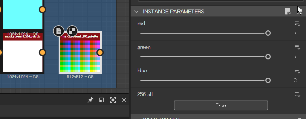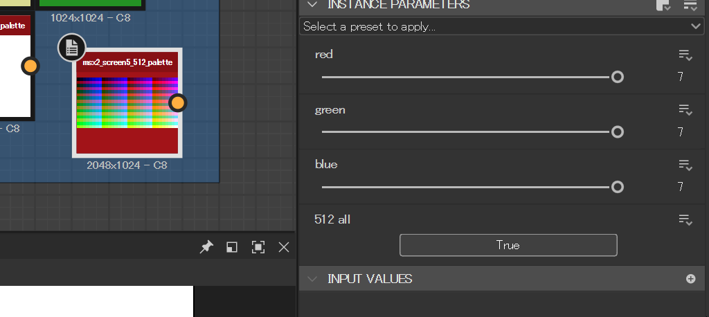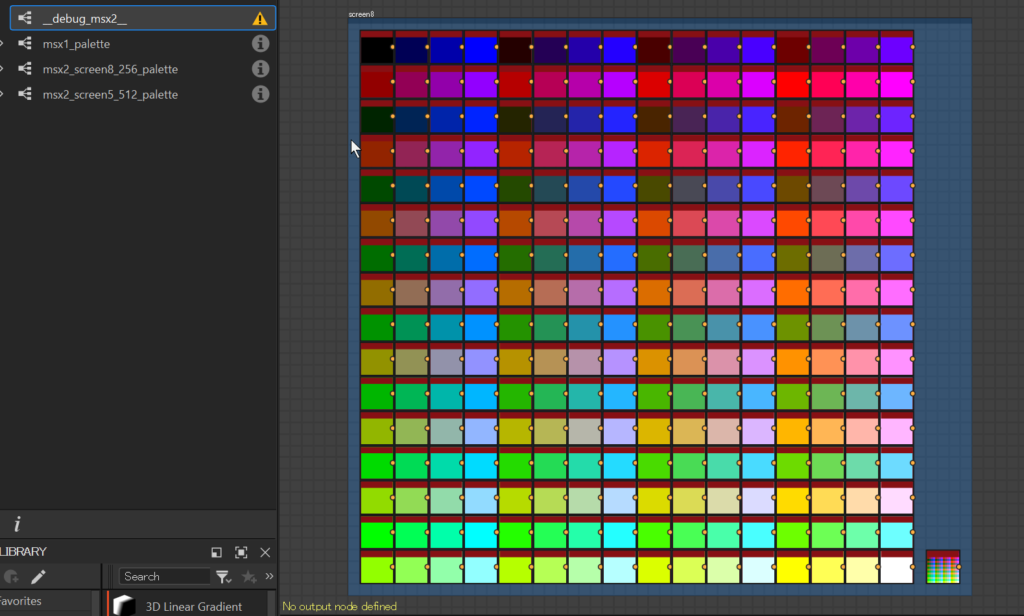 特定のカラーセットを収めたパレットノードはプロシージャルにイラストを作る際に使うつもりである。この間MSX2という古いパソコンの256色パレットと512色(中16色)のパレットを作ったのでシェアしておく。