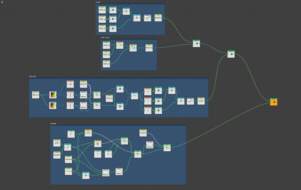 XYZ要素の3次元空間の距離をもってして色の距離とする。この実際の色の距離を各要素の計算割合で決定した全体距離で割り、閾値でマスク判断する色の距離とする。マスクのぼけ幅が0の時はマスク値は1か0のどちらか、 ぼけ幅がある場合、いきなり0とならずぼけ幅分を線形に減少して0になる。