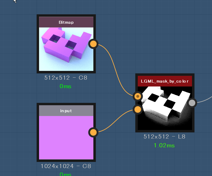 第二入力は単独カラーを想定してはいるが、実際は任意の画像を使う事が可能である。対応する位置で色が近いとマスクになる。2つの画像の差分を出すのに使える。