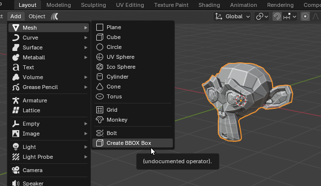 タイトルの物を(ChatGPTと相談しつつ)作った。何に使うかというと、モデリング中のオブジェクトに対してBooleanモディファイアで加工する際、足し引きするオブジェクトが必要になるが、そのサイズはモデリング中のオブジェクトと同じか近い大きさであると便利なことが多い。なのでオブジェクトを選択してアドオンを実行すると選択中のオブジェクトの位置と大きさに合わせて新規BOXを作成するアドオンを作った。